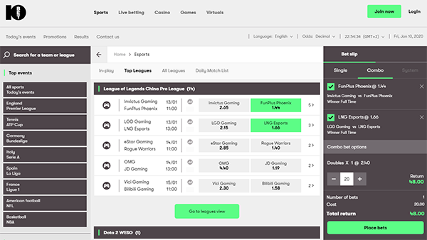 Established in 2003, 10Bet runs on the elegant and fast SBTech sports betting platform. This ensures a clean user experience on all devices. You’ll also find expansive esports league coverage and competitive odds. Esports events are accessed from the left navigation index of all available sports. 10Bet have not yet entered esports team sponsorship deals, but they have been the sponsors of both English and Italian football clubs.